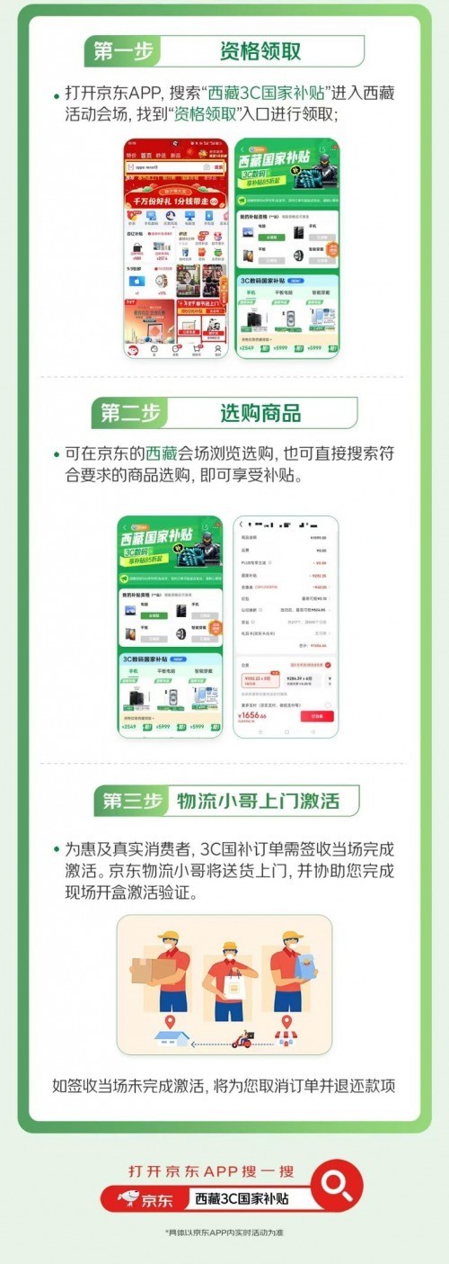 具体领取与使用流程为:打开京东APP搜索“西藏3C国家补贴”进入活动会场,找到“资格领取”入口进行领取。领取后可在京东的西藏会场浏览选购,也可直接搜索符合要求的商品选购,即可享受补贴。